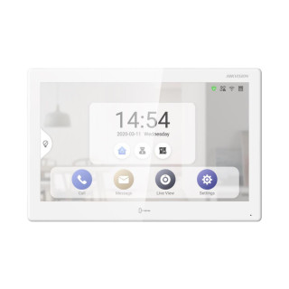 Відеодомофон кольоровий для IP домофонної системи, 10" TFT LCD, підключення до 9 багатоабонентських панелей виклику, до 9 індивідуальних панелей виклику і до 8 додаткових моніторів, до 16 IP камер, 8 входів для датчиків, гучний зв'язок, запис фото і відео на карту пам'яті до 32 ГБ. Підтримка SIP P2P. Живлення 12В/PoE. Розміри 270x168x25 мм, колір білий