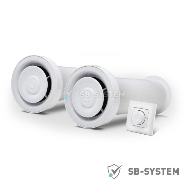 2 рекуператори Ventoxx Champion (під керування Twist), Ефективність рекуперації 74-86%, Продуктивність 17-60 м³/ч, Споживана потужність 1,6-4,6 Вт, Рівень шуму 16-43 дБ, 11 програм і 3 швидкості роботи, Максимальна товщина стіни для встановлення 485 мм, Робоча температура від -20°C до +50°C. Труба довжиною 500 мм, діаметром 150 мм.