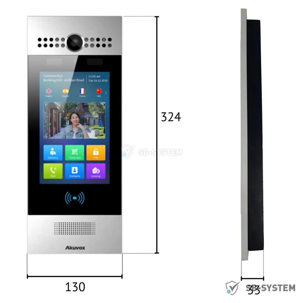 SIP панель виклику з функцією розпізнавання обличчя та зчитувачем RFID-карток. ОС Android 9.0 з можливістю встановлення стороннього ПЗ та кастомізації. 8” сенсорний екран IPS LCD 1920x1080. Подвійна камера для унеможливлення підробки зображення обличчя та додаткова камера підвищеної світлочутливості. Кодеки: відео H.264, аудіо G.722. Підтримка протоколу Wiegand. Зчитувач RFID-карток 13.56 мГц та 125 кГц. Підтримка Bluetooth. Підтримка PoE (IEEE802.3af). Матеріал: нержавіюча сталь 316. Клас захисту IP65. Настінний або врізний монтаж за допомогою додаткового монтажного комплекту.