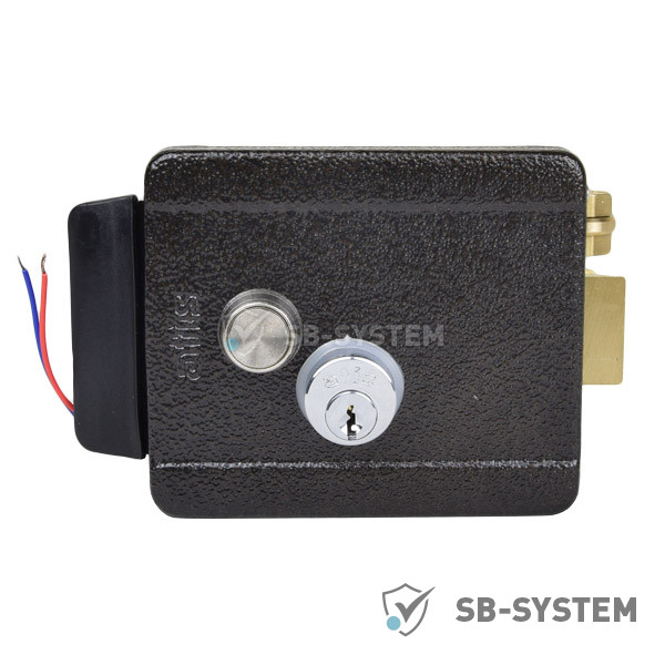 Електромеханічний замок, накладний, встановлення внутрішнє, ліве / праве, пофарбований метал, кнопка виходу на замку, тип ключа - зубчастий, 12В / 2А, колір коричневий.