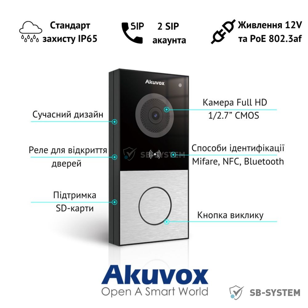 Роздільна здатність до 1080p – 25fps. Кути огляду: 123° (Г) / 69° (В). 1 x RJ45 10/100 Мбіт Ethernert порт. Клас захисту: IP65. Двосторонній VoIP зв'язок з ехозаглушенням. Повний контроль із 1 релейним виходом. RFID зчитувач карток: підтримка 13.56 МГц