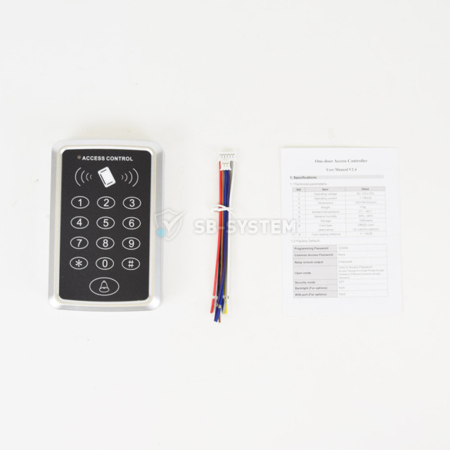 Кодова клавіатура, вбудований зчитувач EM-Marine, 1000 кодів і карт, відстань зчитування карт 1-15 см, пластиковий корпус, робоча напруга DC 12V, споживання 100мА, вихід реле (NO, COM, NC), підключення кнопки виходу, дверного дзвінка. Розміри 120х78х22 мм