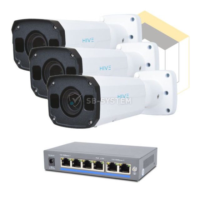 Комплект для керування і контролю доступу автотранспорта на 3 камери включає: 3 камери Hive UVF, PoE комутатор ATIS PoE-1006-4P/250m