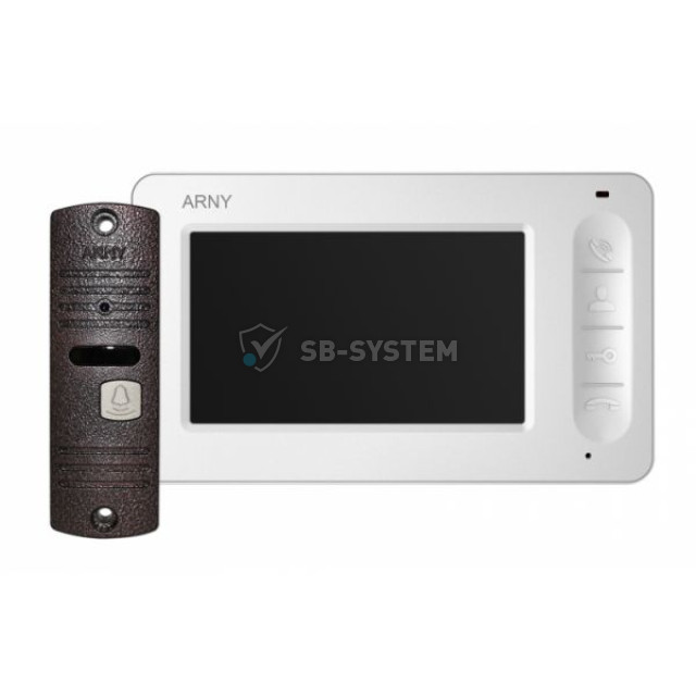Комплект Arny AVD-7005 (білий/мідний) складається з кольорового відеодомофона Arny AVD-705 із сенсорними кнопками керування та кольорової панелі виклику Arny AVP-05. Колір домофона білий. Колір панелі виклику мідний.