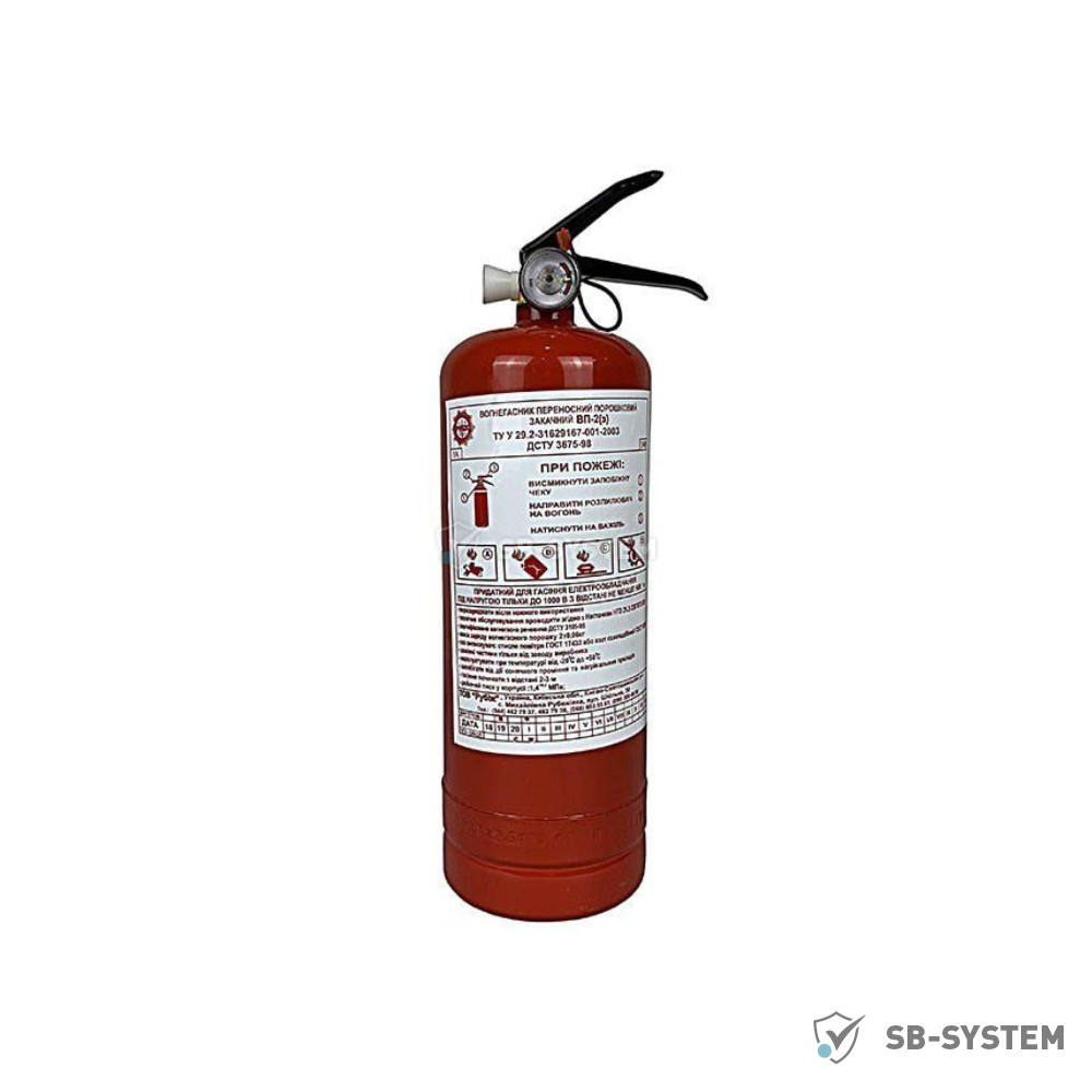 Вогнегасник порошковий ВП-2(з) (ОП-2) для локалізації пожежі класу А (горіння твердих речовин та матеріалів), B (горіння рідин), C (горіння газів), E (горіння речовин та матеріалів електроустановок, що знаходяться під напругою).